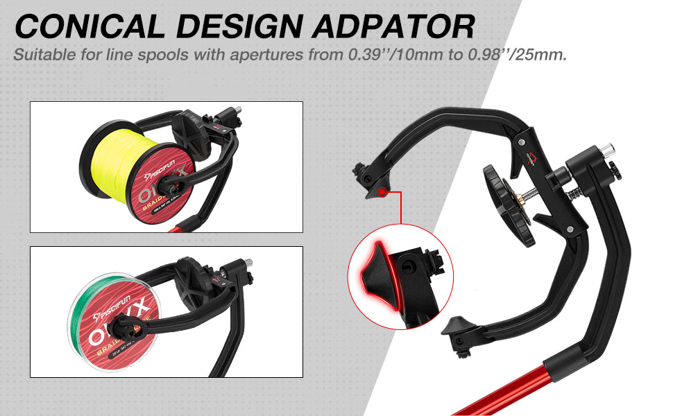 - CONICAL ADPATOR - The conical design adaptor is suitable for line spools with apertures from 0.39’’/10mm to 0.98’’/25mm. The adaptor rotates with the line spool when winding, which reduces noise, while still maintaining the perfect spool tension. This design makes for easy and smooth operation.