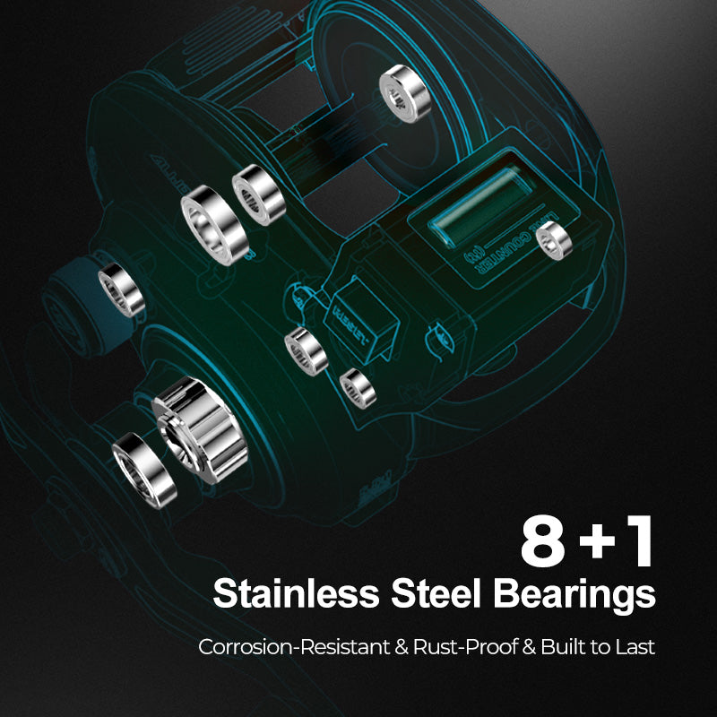 8+1 Bearings: 8 double-shielded stainless steel bearings and 1 one-way bearing that are corrosion-resistant. They are designed to withstand the intrusion of sand and saltwater, providing long-lasting performance.