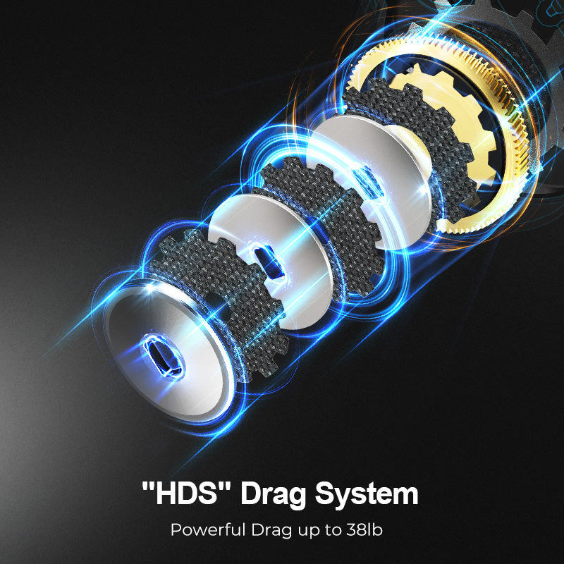“HDS” Drag System with 38lbs Max Drag: Equipped with a smooth, high-performance drag system that combines carbon fiber, stainless steel, and anodized aluminum. This layered construction increases surface contact and friction, delivering up to 38 pounds of powerful and consistent drag force—ideal for battling big game fish.
