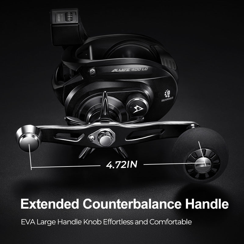 Counterbalance Handle with Extended Arm and Knob: Featuring a 120mm extended counterbalance handle with a large EVA round knob for superior grip and torque. The balanced arm design matches the reel’s center of gravity, minimizing wobble during high-speed retrieves and reducing fatigue for all-day casting.